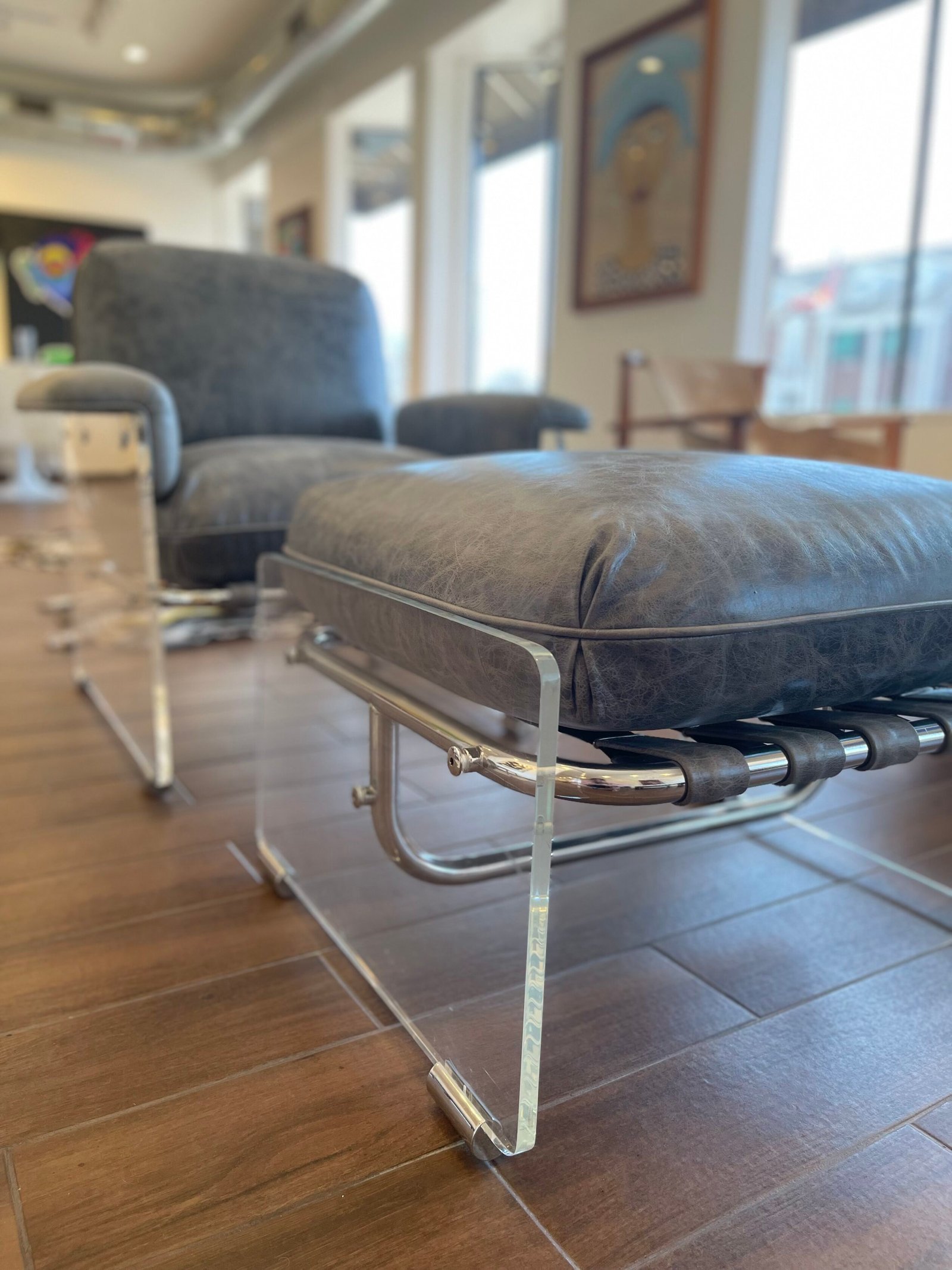 Step into a world of timeless luxury with these stunning 1970s Pace Collection lounge chairs. Featuring bold Lucite panels, chrome accents, and distressed smokey Italian leather cushions, these chairs blend modern elegance with vintage allure. A true statement of sophisticated design and unparalleled craftsmanship.